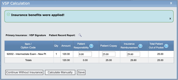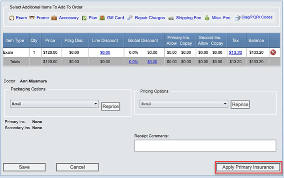 Click Apply Primary Insurance. This time, the benefits are calculated without errors and you can save, price and invoice the order.