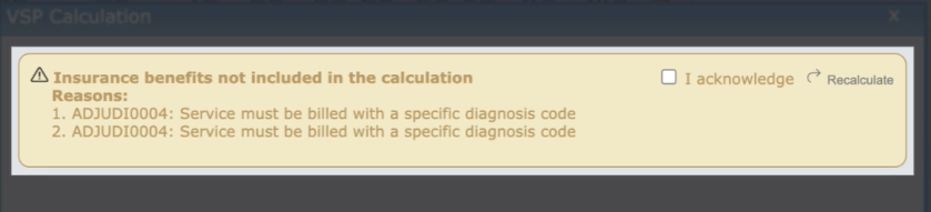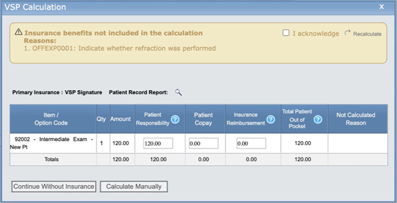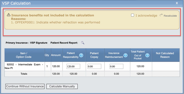 If the order is exam only, on the warning, select I acknowledge and click Recalculate.
