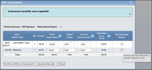You now have visibility to errors and warnings in Point of Sale (POS), which allows you to address issues prior to submitting the order and a claim. These enhancements aim to reduce order and claim errors, save time and improve patient satisfaction. The calculator features are similar to what you have been using in Claims Management, just available earlier in the ordering process. The VSP Calculator supports a select group of plans, see VSP Plans Available for Automatic Benefits Calculation.