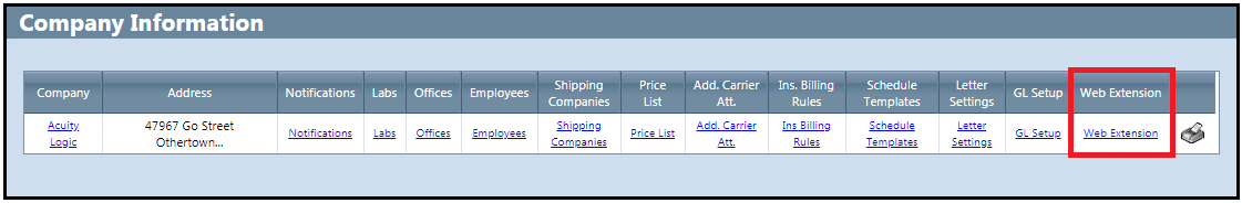 - In the Company Information window, click the link for your company in the Web Extension column.
