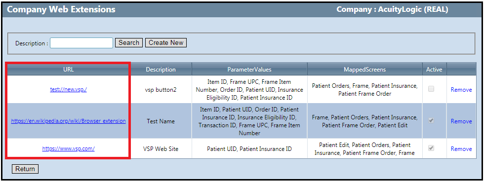 - Frame (Admin) — In this window, the URL buttons are icons in the new URL column, which is visible only when at least one URL button is configured for the window. When you hover your cursor over a URL icon, a tool tip containing the name of the icon appears. Clicking the icon opens the external website to which it is linked.