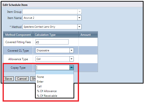 Many Spectera plans now require a copay on formulary contact lenses. To accommodate this, a Copay Type field was added to the Spectera Contact Lens Only method: