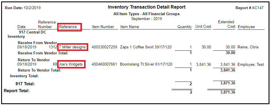 Previously, if you selected the Extended Reference option when you ran the Inventory Transaction Detail Report (AC147), the report showed the vendor name for transactions received from vendors but not for transactions returned to vendors.