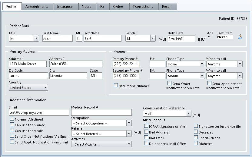 This image shows the patient demographics transferred to ExamWRITER: