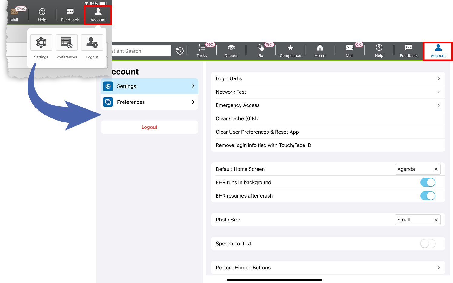 You can now change settings more easily in the iPad app. We combined the Settings, Preferences, and Logout functions onto one screen. This layout aligns more closely with iPadOS, making it feel more familiar. Previously, these functions were presented as three separate buttons.