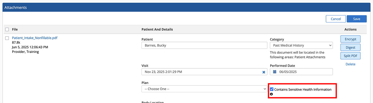 - Within Manage Attachments, doctors can manually identify attachments that contain SHI by selecting the Contains Sensitive Health Information check box.