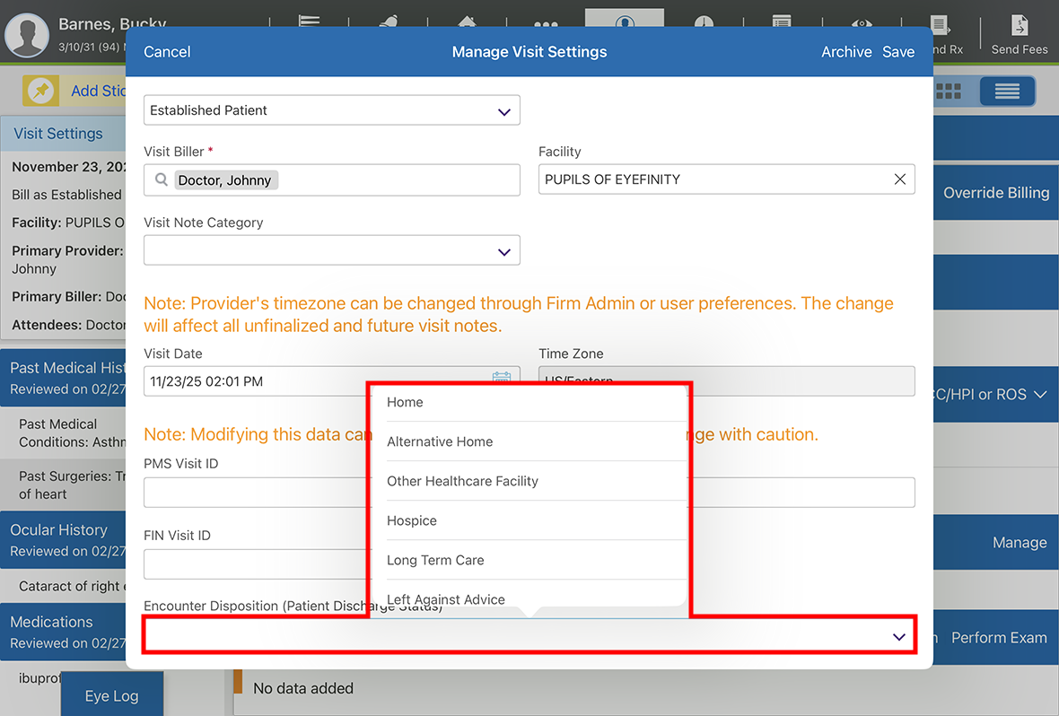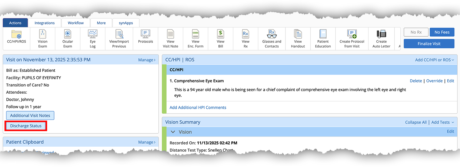 If your practice administrator has enabled the feature, you can now record a patient discharge status. This feature is intended for large ophthalmic centers, and statuses include such options as home, left against advice, and other healthcare facility. Here's how to record the discharge status: