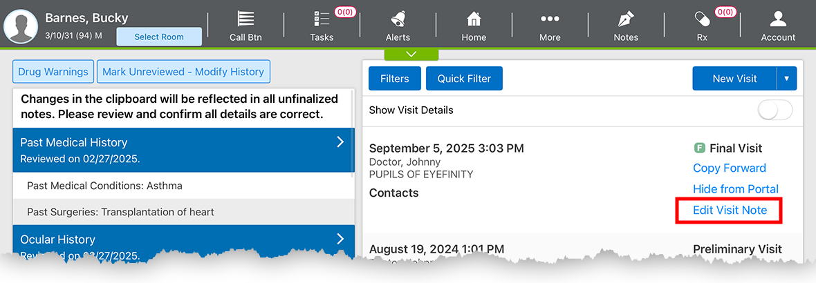 - When the visit is refinalized the patient's most current clipboard data appears in the final visit note—the current clipboard data may differ from the data that in place on the date of service.