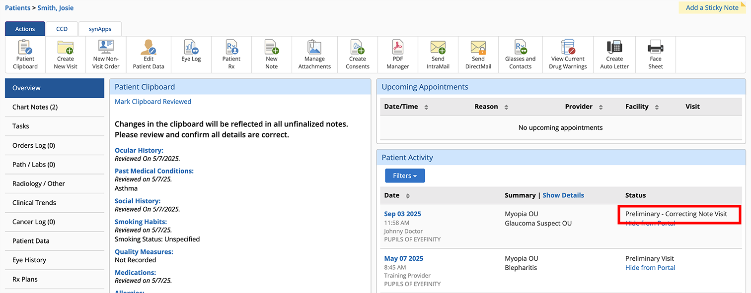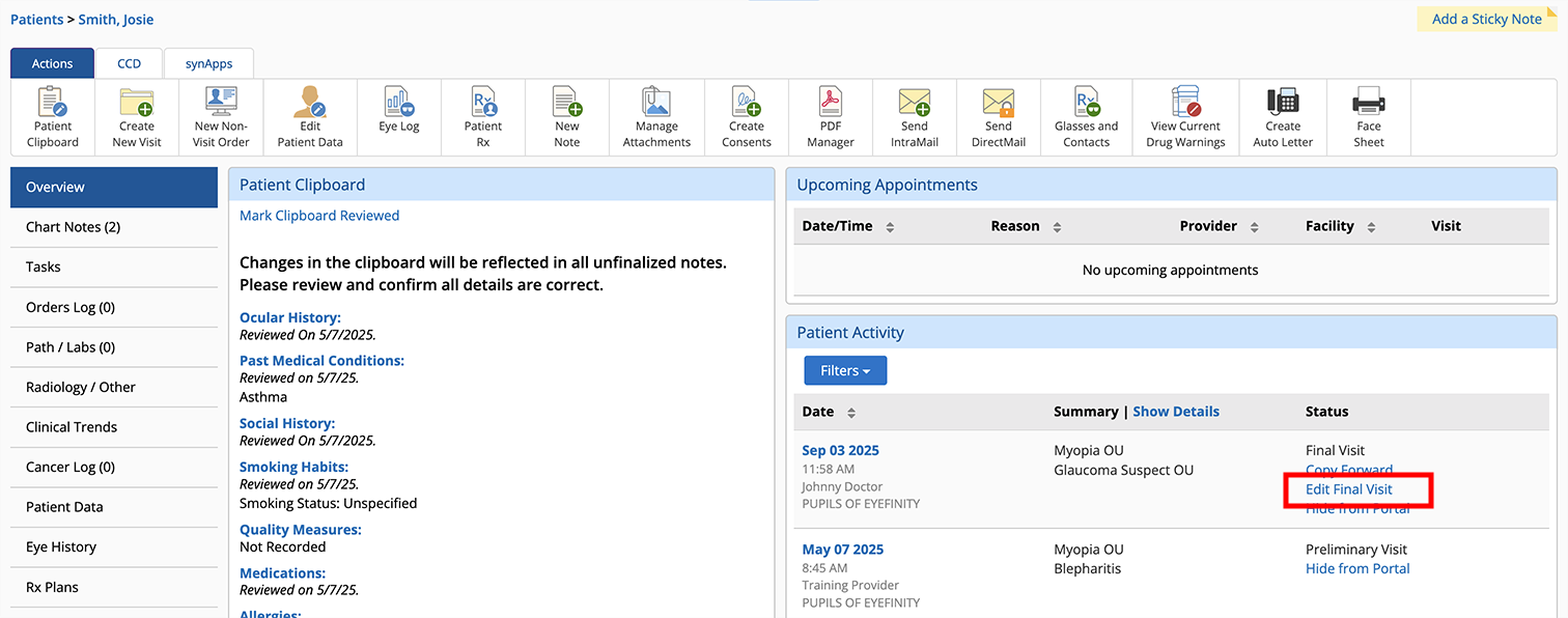- Open the Patient Overview, locate the visit in the Patient Activity section, and click Edit Final Visit.
