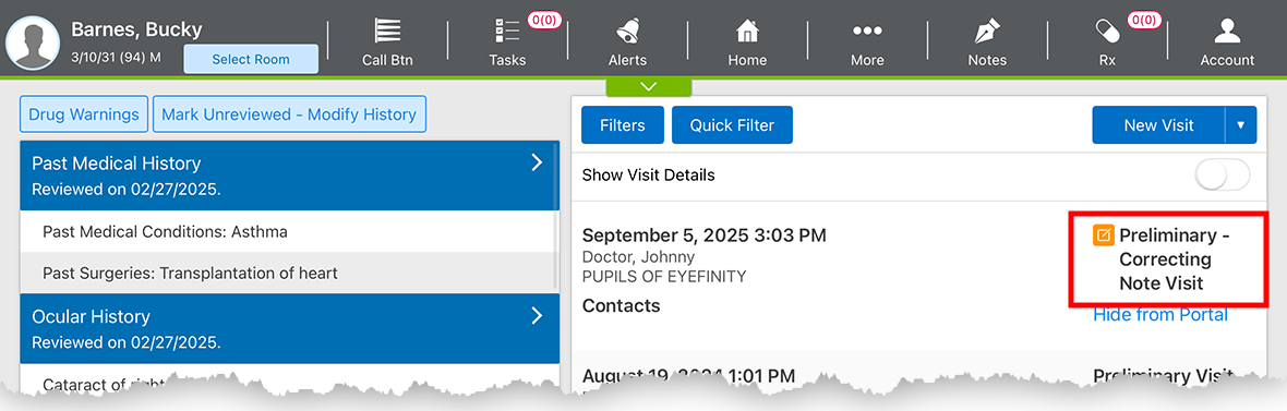 No matter which route you take, you'll need to review the warnings and confirm that you want to continue editing the note. The visit's status changes to Preliminary - Correcting Note Visit. Edit the visit and finalize the visit again.
