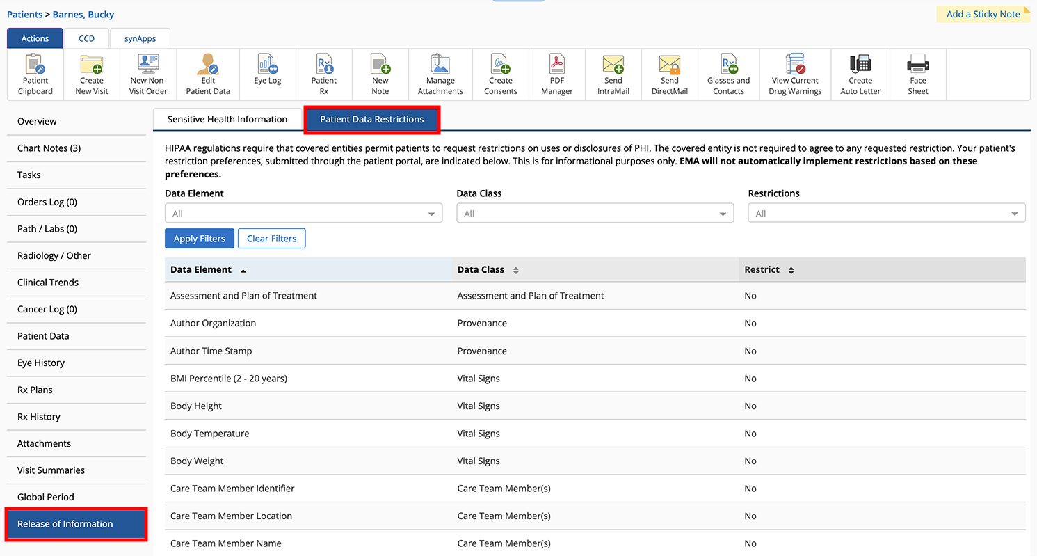 Patients, or their authorized representative, can now request to restrict specific elements within their record from being shared outside your practice. At this time, these preferences generate a notification to the practice staff and do not suppress data within the printed visit note or CCD.