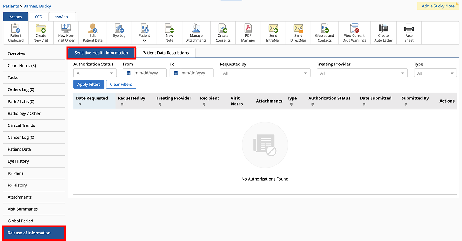 - Staff can manage authorization requests from the Release of Information tab in the patient’s chart. Only providers can obtain written Patient Authorization or perform Overrides, and when doing so, will become the Treating Provider. Once authorization is received, the pending transmission will be sent.