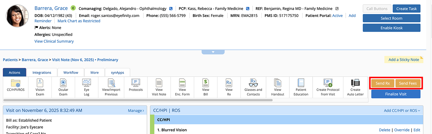 The Send Rx and Send Fees buttons are now located above the Finalize button. This means the buttons are always visible and you no longer need to tap the action bar Integrations tab to access them. The buttons indicate the status of fees and prescriptions just as they do in the iPad app.