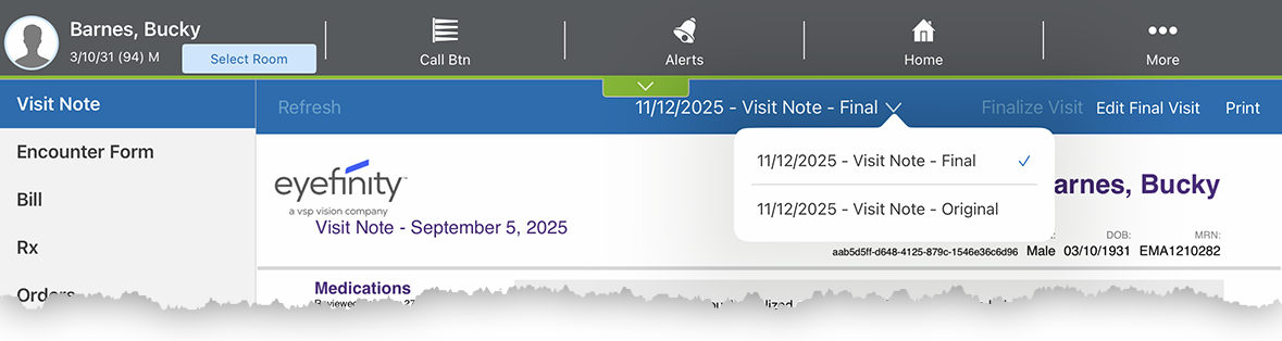 - Review all the different versions of a visit note. Encompass retains a version history of visit notes that are unfinalized an refinalized. When you view a visit note that has been refinalized, you'll see a Visit Note drop-down menu just above the PDF. When you click that drop-down, you can select a prior version of the note to view it.