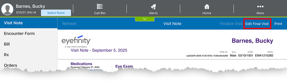- View the Finalized Visit, click the Actions tab, and click the Edit Final Visit action bar icon.