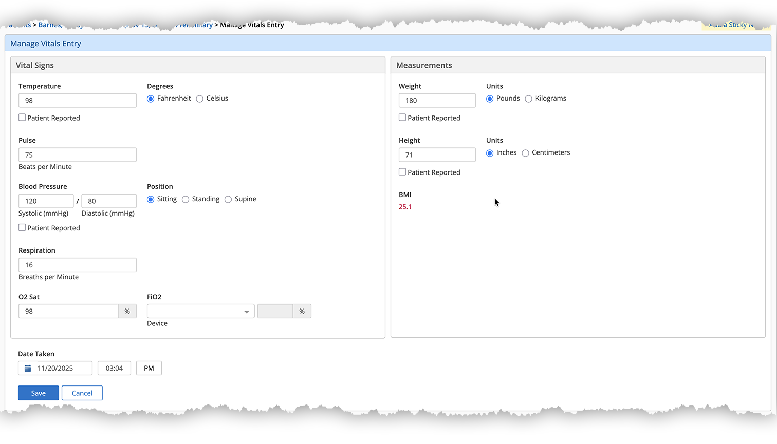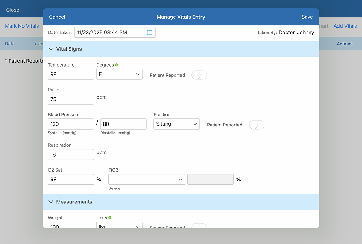 - We redesigned the Vitals Entry screen as a popup window. With this redesign, we moved the most commonly recorded vitals to the top of the screen, and the fields now check for valid values.