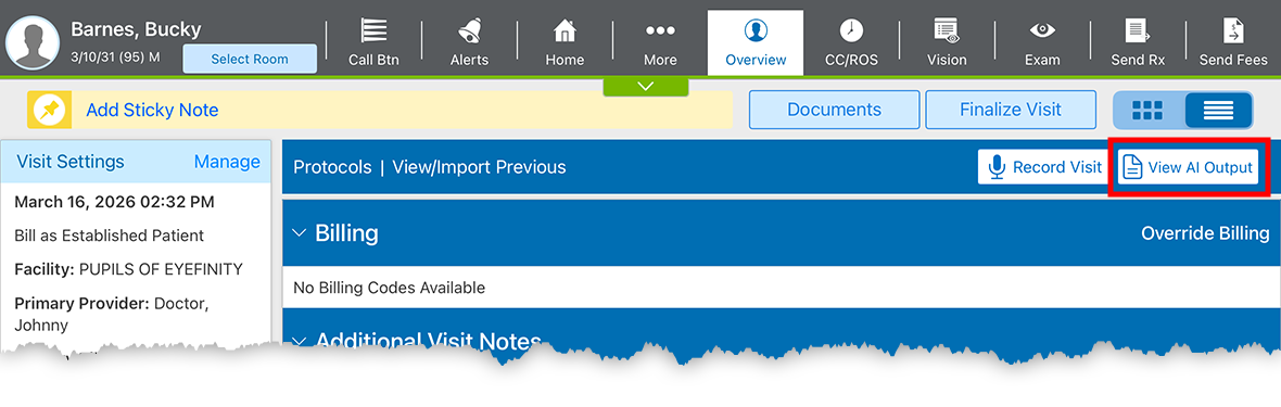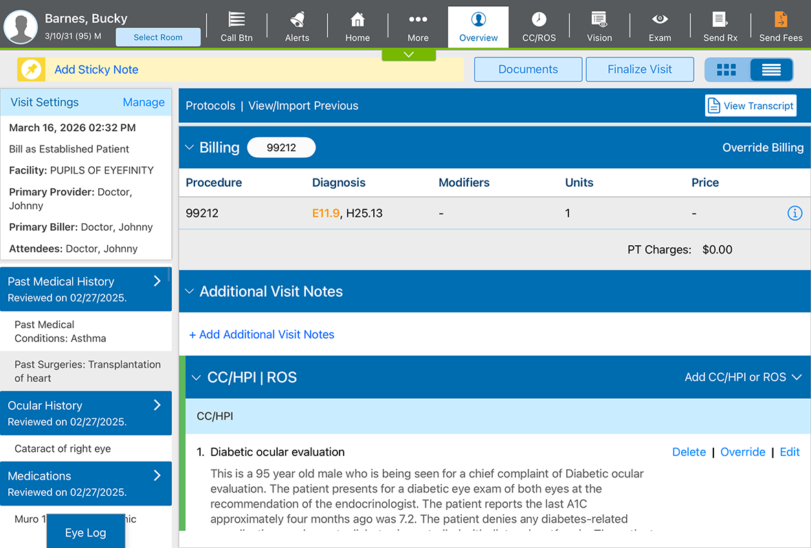 Encompass returns you to the Detailed Visit Overview and displays the visit populated with the accepted exam elements, including suggested billing codes.