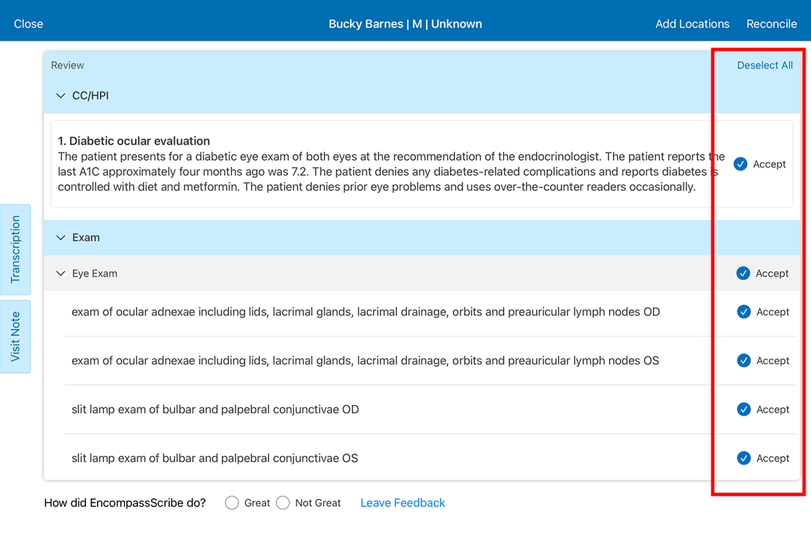 The EncompassScribe Reconciliation screen lists all the exam elements spoken during the visit. The exam elements are categorized into sections that correspond to the sections you're accustomed to seeing in the Detailed Visit Overview (e.g., CC/HPI, Exam, Impressions and Plans). To review the suggested documentation, follow these steps: