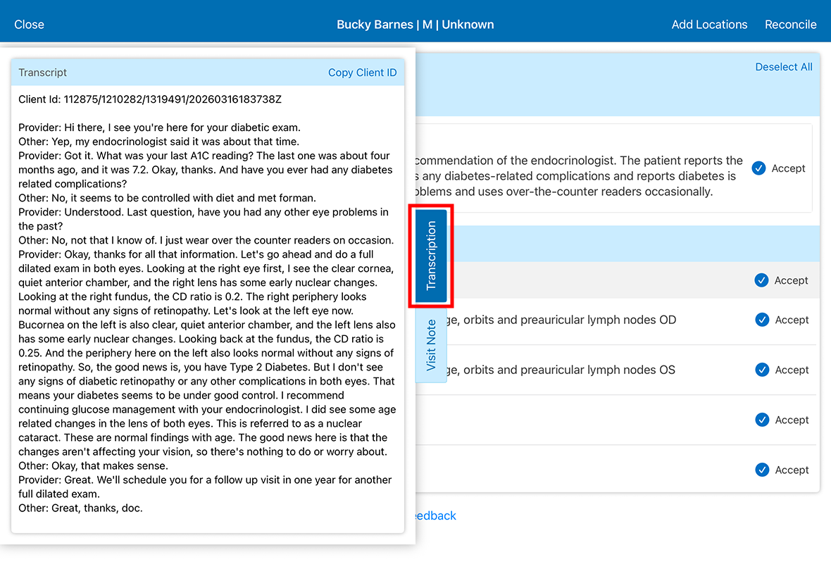 - Tap the Transcription tab again to hide the transcript and continue reviewing the suggested documentation.