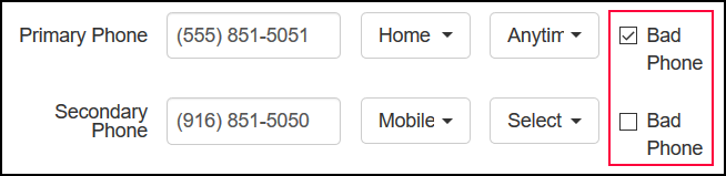 New Bad Phone check boxes have been added next to the Primary Phone and Secondary Phone fields in Demographics, to enable you to indicate when the patient's provided phone number is incorrect. If you select the Bad Phone check box, the Primary Phone field is no longer required.