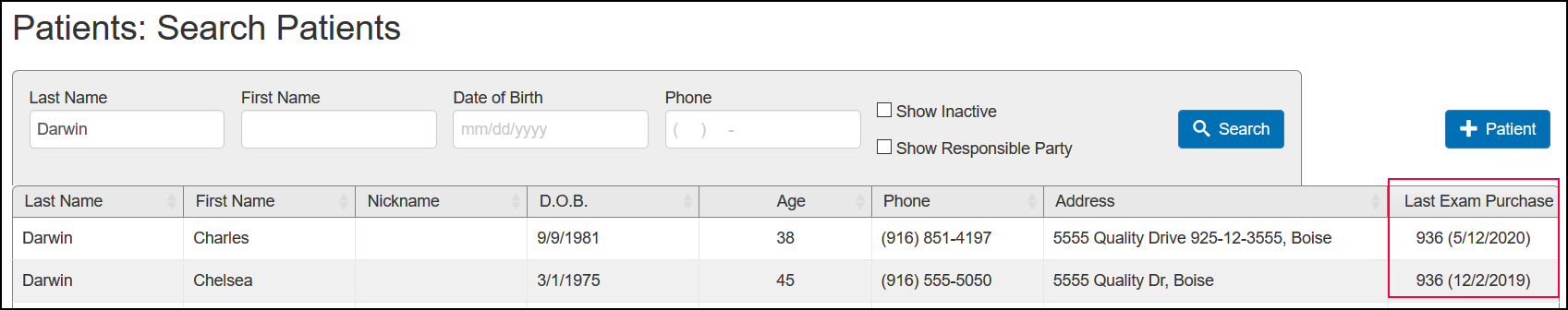 The Office column in the Search Patients results list has been renamed Last Exam Purchase and now includes both the date and office location of the patient's last exam.