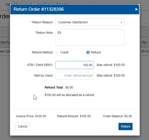 For returns, the return order screen displays the ATM/Debit field with the last four numbers of the card and displays the max refund amount.