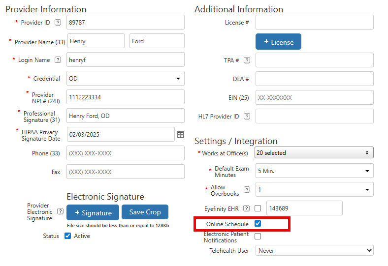 We recommend you review your providers and resources to ensure the individuals you want patients to be able to schedule an appointment with online have the Online Schedule checkbox selected.