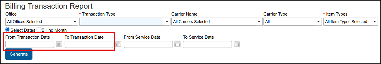 Option to Change Transaction Date Filter Criteria on the Billing Transaction Report