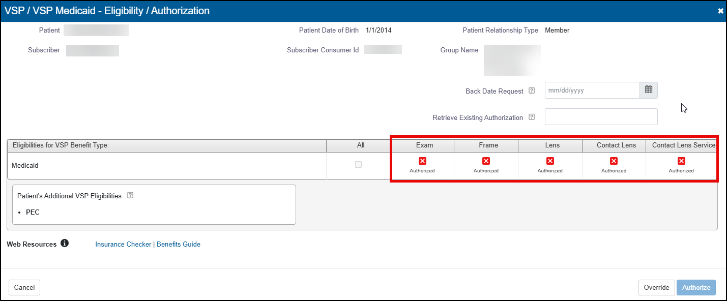 VSP in-network offices will also see a notification if the patient has an outstanding authorization that has either expired at your office or was pulled by another office in your company. In these cases, the word "Authorized" displays for each affected benefit type in the Eligibility/Authorization screen, helping you understand what is happening with the eligibilities. Previously, Encompass would show an "unavailable" error message.