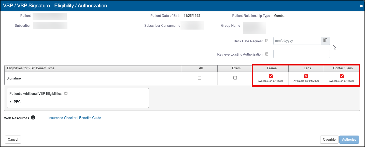 If your office is a VSP in-network office, you'll now see a Next Eligible Date for any unavailable VSP eligibilities in the Eligibility/Authorization screen. This update makes it easy to see when your patients' benefits renew, saving you time and helping you provide a great patient experience. The date displays for all eligibility types.