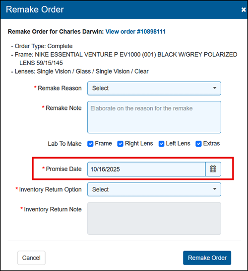 We've updated the Remake Order window to include a Promise Date field. This allows you to set the promise date even when the product doesn't change (1-click remake). This new field defaults to the promise date set in Admin, but can be changed. The date you enter is saved and then shown in the pricing screen and printed on the order. You can change the date in the pricing screen, if necessary.