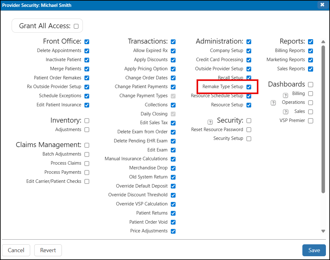 We've also added a new security permission for providers and staff that enables you to control who has access to the Remake Types setup screen. The new check box defaults to selected. We recommend reviewing your security settings and deselecting the check box for any providers or staff who you do not want to have access.