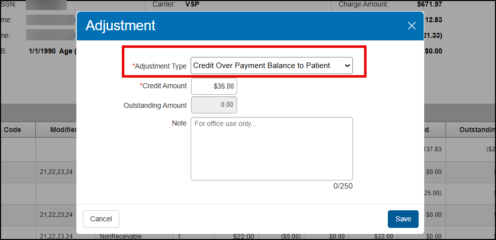 This new option is available only for line items with a negative insurance receivable balance. The Credit Amount cannot be more than what the patient originally paid in Front Office.