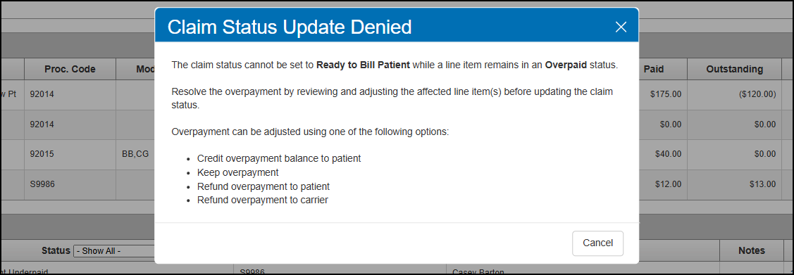 The system now stops you from incorrectly changing a claim's status to Ready to Bill Patient when one or more line items on the claim has a negative insurance receivable (Overpaid status). A new message displays when you click the Ready to Bill patient button, instructing you to adjust the affected line items to resolve the overpayment. This update prevents patient statements from being generated in error when the patient is owed a refund or a credit to their account.