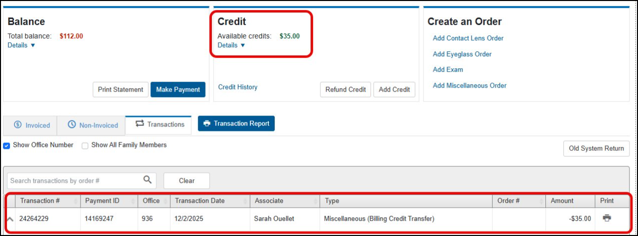 After you save the adjustment, the credit transfer is shown in the patient's Front Office records. The credit amount is added to the patient's available credits and the credit transaction is displayed as a Miscellaneous (Billing Credit Transfer) type transaction in Material Orders.