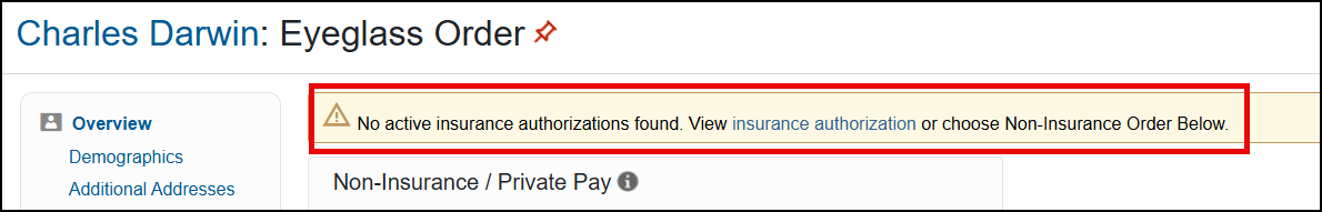 We've updated the message that displays on the insurance selection screen when you start an order for a patient who doesn't have any active authorizations. The message now includes a link to the patient's Eligibility/Authorization screen, enabling you to easily add an authorization. You'll see this updated message when you start a new eyeglass, contact lens, or exam order.