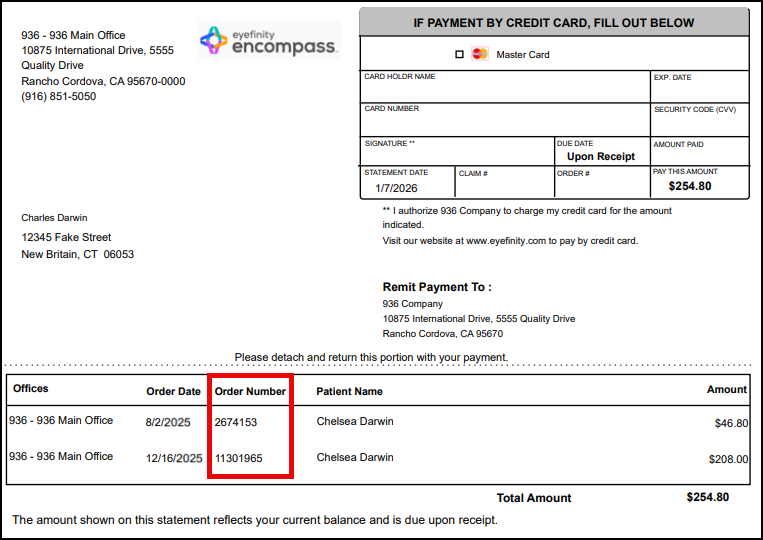 If your company is set up to generate patient statements in summary format, the statements will now include order numbers. For information on selecting the statement format, see Setting Up Patient Statements and Statement Notifications.