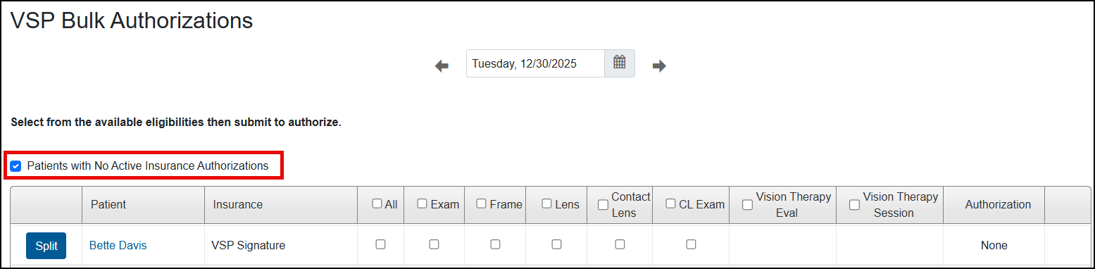 We also added a new Patients with No Active Insurance Authorizations check box that filters the patient list to display only those patients that need new authorizations. The check box is selected by default when the screen opens, to reduce the time the screen takes to load, but you can deselect it to see all VSP patients with appointments on the selected date, regardless of authorization status.