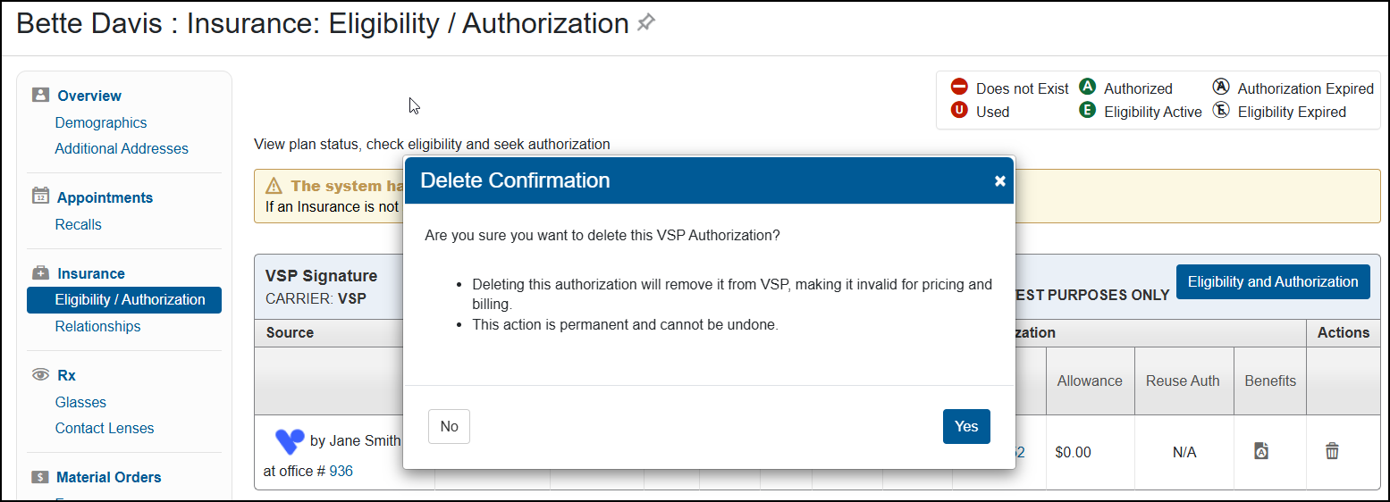 With this release, you'll see a new confirmation message when you delete VSP authorizations that were pulled electronically through the VSP integration. The message is a reminder that deleting the authorization from Encompass also deletes it from the VSP system, and that the deletion cannot be undone. This update is intended to help prevent failed claims due to staff deleting electronic authorizations and then later re-entering the invalidated authorizations manually using VSP Override.