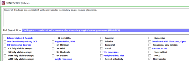 - Gonioscopy and Provocative Testing selections in the Neovascular section