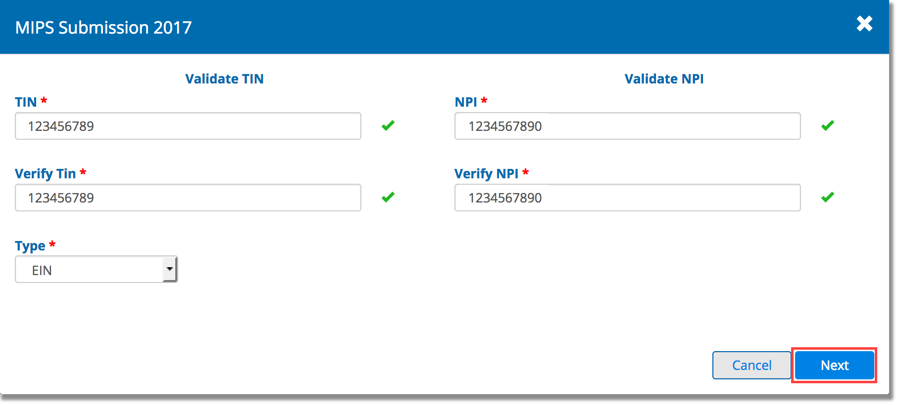 - If you’re attesting as an individual, validate your TIN (tax identification number) and your NPI and click Next. Group authorizers, skip to step 4.