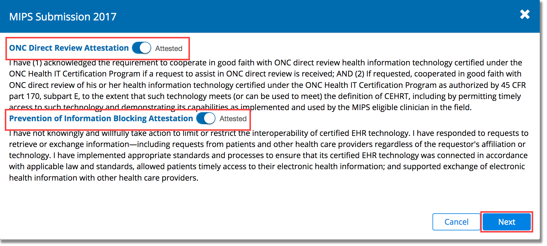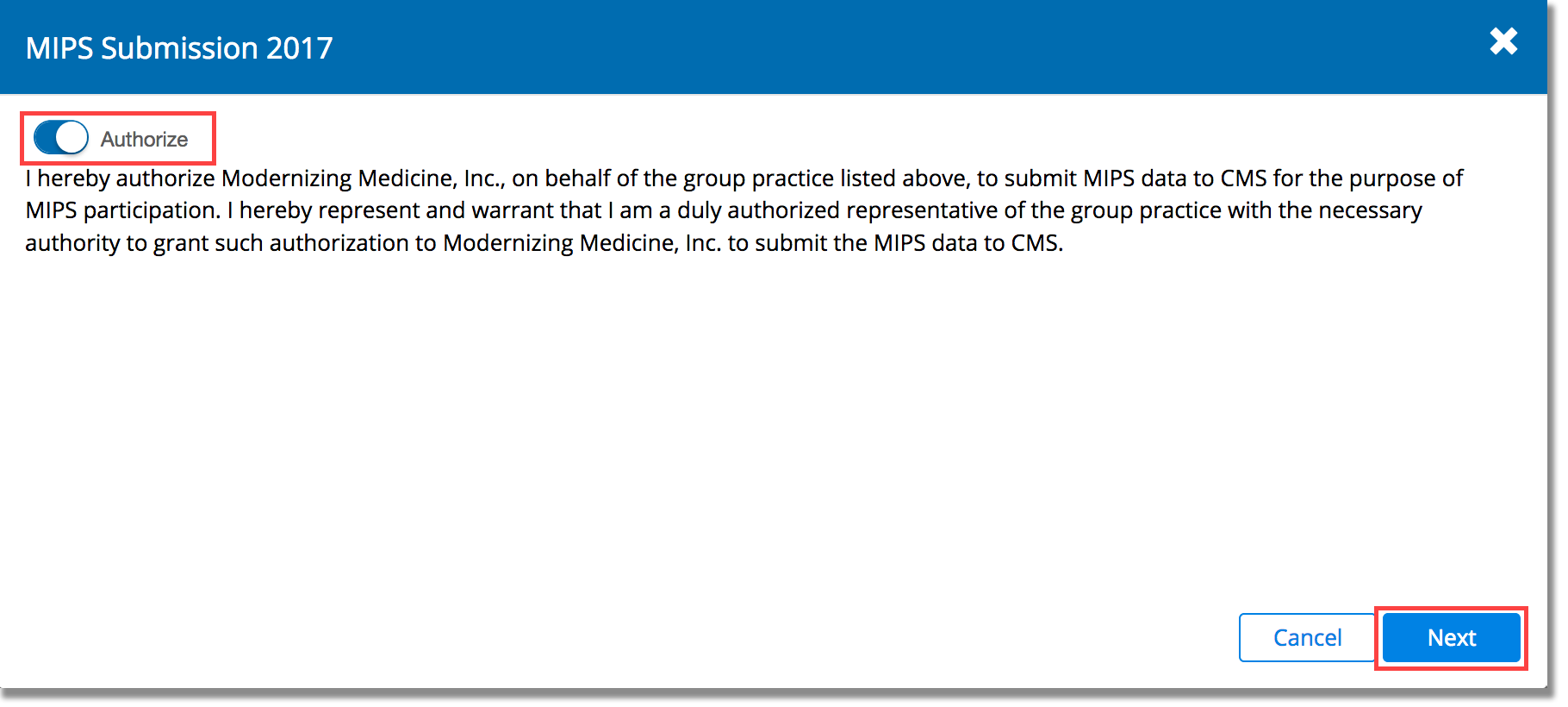 - Click the toggle switch to authorize Eyefinity’s partner to submit MIPS data to CMS on your behalf and click Next.