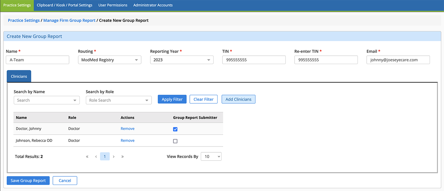 - Select one or more clinicians as the Group Report Submitter. The submitter is responsible for confirming the performance data and authorizing the group’s data submission to CMS.
