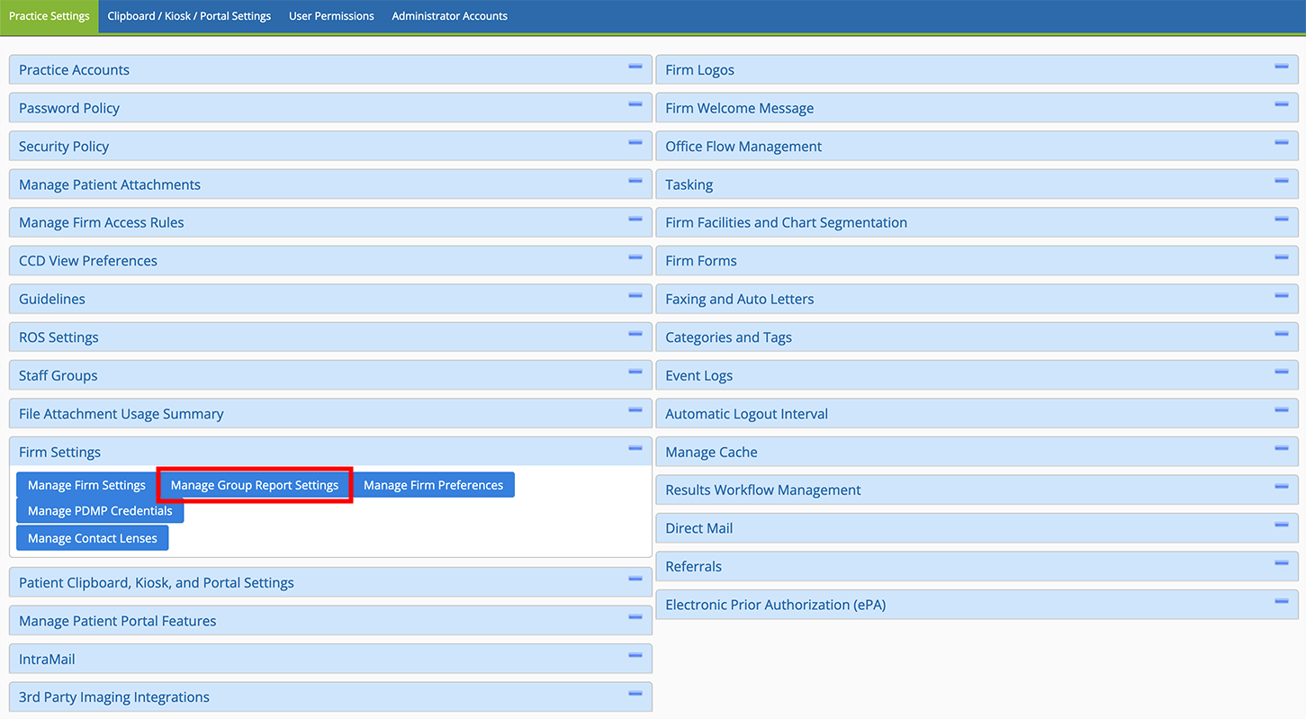 - Locate the Firm Settings group and click Manage Group Report Settings.